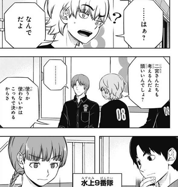 よって二宮隊の明日の作戦は、射程の長い相手に勝てるユニットを作ると言う方針に決まりかけます。しかし絵馬の考えに対して二宮が、それで本当に大丈夫か?と、意見を言います。相手がリスクを度外視して、裏を掻いてくる可能性もあるぞ?と、二宮は絵馬に意見を言います。絵馬も二宮の意見に対して、その可能性はあると答えますが、それでもランク戦をずっとやって来てB級隊員には『まじめな人』が多いと思うと言います。まじめな人だから、負けたら反省し、やられたら対策をする、そういう人が多いと絵馬は言います。