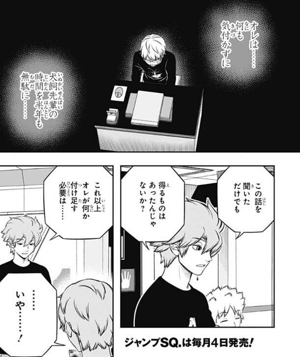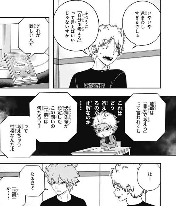 犬飼の考えを聞き半崎は、いやいや遠回し過ぎるでしょ、ふつうに「自分で考えろ」って言えばいいじゃないすか、と言いますが、それが難しいと犬飼は答えます。若村は「自分で考えろ」と言われても、犬飼が設定したこの問いの『正解』は何だろう?って考えちゃう性格なんだよ、と犬飼は言うと半崎は納得し、ヒュースも、そこまでの考えがあるなら、オレが麓郎にあれこれ言うのは控えたほうがよさそうだな、と言います。