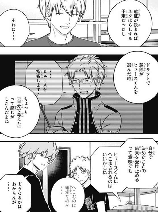 トリガーを使った戦闘で一番大きな要素はトリオン量の大小で、一方でさっき若村が言ったのはチーム成績の優劣の話だ、と言い、単純にチームとして玉狛第2の方が香取隊より上だったと言う結論では不満なのか、とヒュースは聞きますが、若村は、三雲の代わりに玉狛第2に入ってもB級2位になれたか自信がない、と言います。さらに、もし三雲が香取隊にいたらもっといい順位を獲っていた気もする、と若村が言うと、ヒュースは、おそらくその通りだろうな、と言います。半崎と笹森はヒュースと若村の会話を間近で聞いていますが、ヒュースが言いにくい事をずばりと言うので傍でひやひやしています。