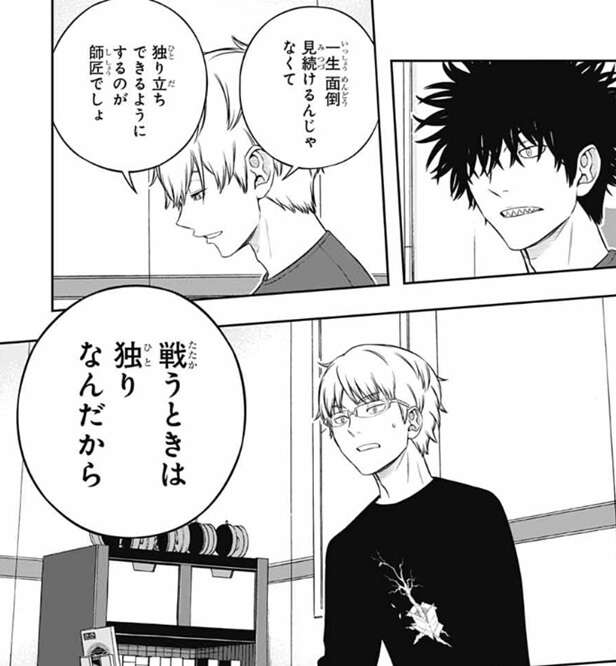 先ほどまでの通信デバイスでの会話を聞いていた影浦は、半崎のふつうに「自分で考えろ」って言えばいいと言う考えに賛成し、師匠なんだから面倒なことやっていないでわかるように教えてやれよと犬飼に言いますが、おれがいなくなったらどうすんの、と犬飼は答えます。