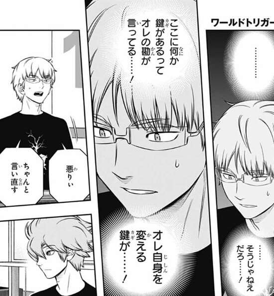 若村は自分と三雲の何が違うのか、疑問をぶつけますがヒュースは質問の意味をよく分かっていません。笹森が、急にどうしたんすか?と、聞きますが、若村はここに何か自分を変える鍵があると感じて、ヒュースに改めて聞きます。