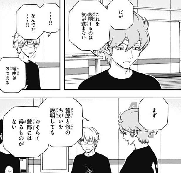 しかし、これを説明するのは気が進まない、とヒュースは言い、理由は三つあると言います。一つ目は、若村と三雲の違いを説明してもおそらく若村に得るものはない、とヒュースは説明します。二つ目は、若村が精神的なダメージを負って、選抜試験に影響が出る惧れがある、とヒュースは説明します。この説明を聞き、どんだけキツいこと言う気だよ、と半崎は心の中であきれます。