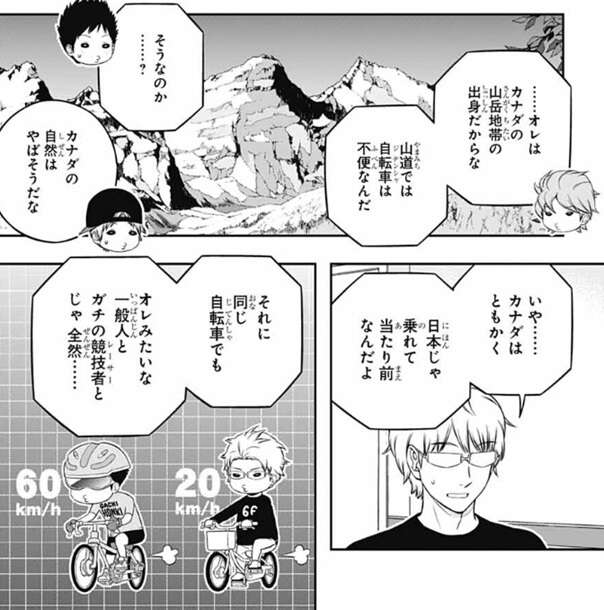 ヒュースはカナダ人と言う設定なので、カナダの山岳地帯の出身だから山道では自転車は不便という設定にしてヒュースは誤魔化します。若村は、カナダはともかく、日本では乗れて当たり前なんだよ、と言い、さらに同じ自転車でもガチのレーサーはもっとすごいと言おうとします。