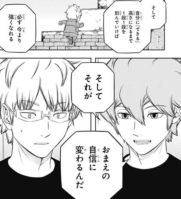 しかし、完全に自信を失くしてしまった若村は、一から出直したとしても万が一それで一番下の段さえ登れなかったら、そもそも最初から1段上る力すら無かったとしたらどうすりゃいいんだ……!?と、若村は弱音を吐きます。するとヒュースは刻むように若村にアドバイスします。目の前の1段を登るために必要な要素を1段の中でさらに刻んで、自分が登れる小さいステップを作るようにヒュースは言い、その行動を努力と呼ぶ、と若村に言います。