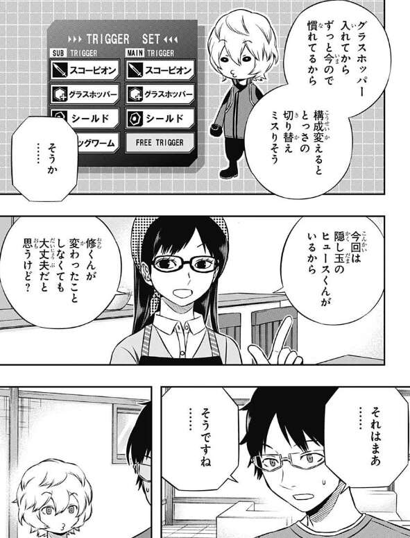 もう1年11ヶ月前になるので、最新話の内容をよく覚えていなかったので見直しました。最新話は164話 「玉狛第2⑳」です。ヒュースが三雲のチームに加入して、ランク戦に初出場する直前で話が止まっています。