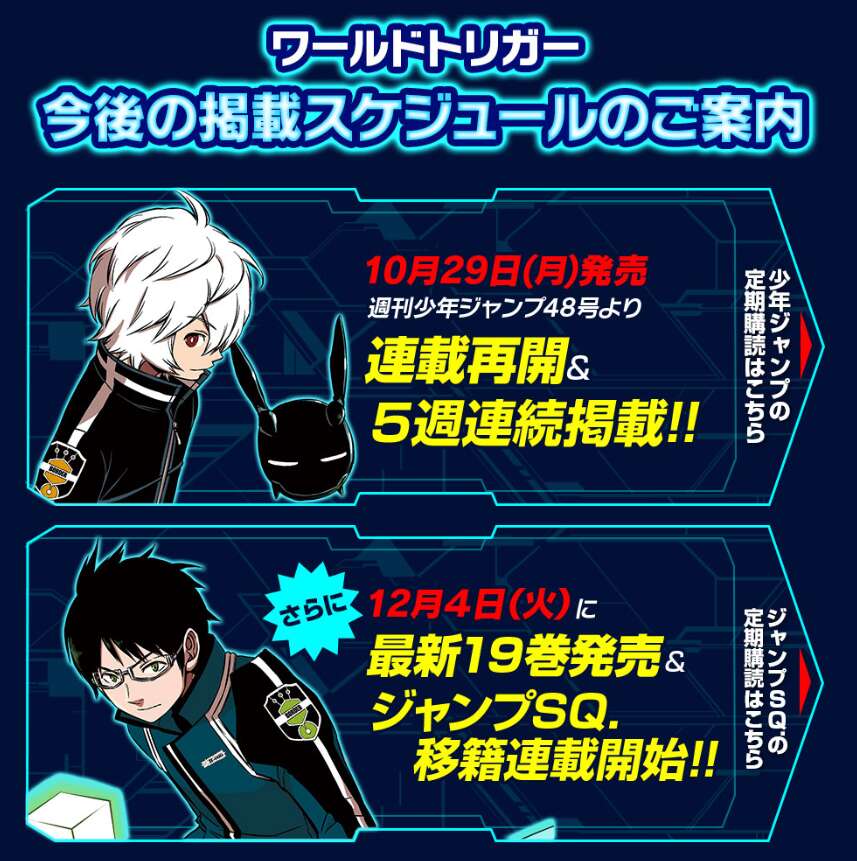 10月29日(月)発売の週刊少年ジャンプ48号より『ワールドトリガー』連載再開!!記念に豪華3大キャンペーン開催! https://t.co/S8fweA5CFJ #ジャンププラス @shonenjump_plusより— 少年ジャンプ+ (@shonenjump_plus) 2018年10月15日
