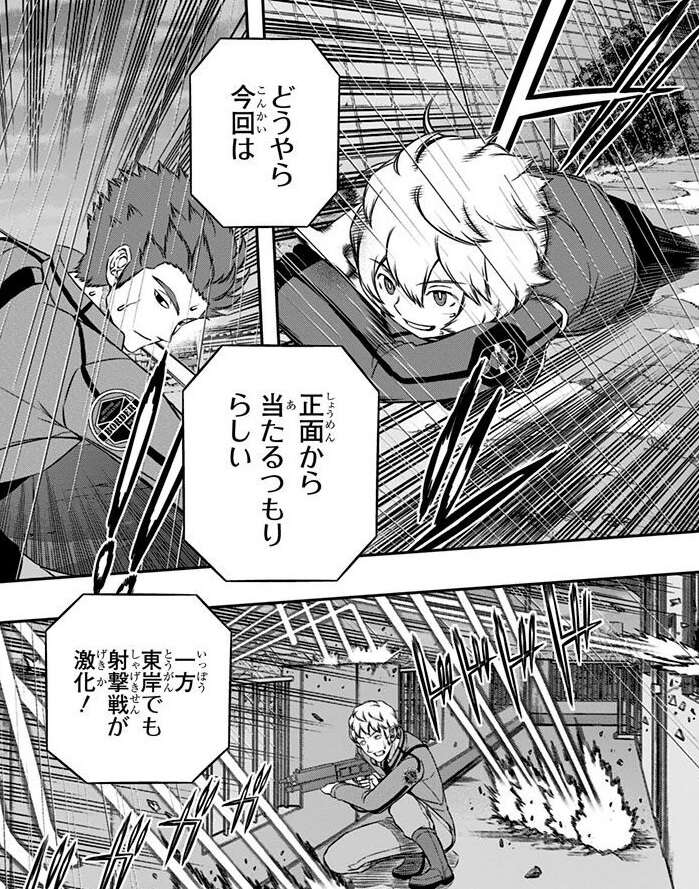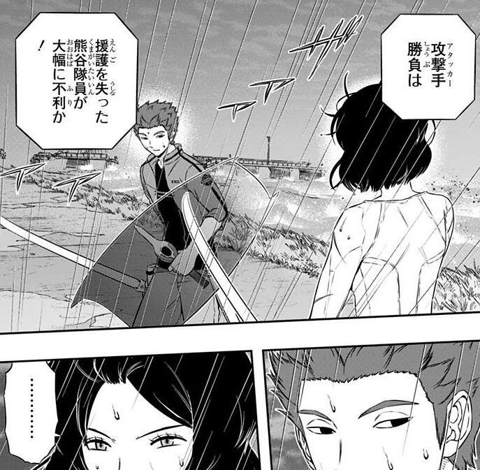MAP東側での戦いが進むと、三雲の指示で雨取が堤防を破壊して川の水を住宅地に引き込む作戦をとります。
