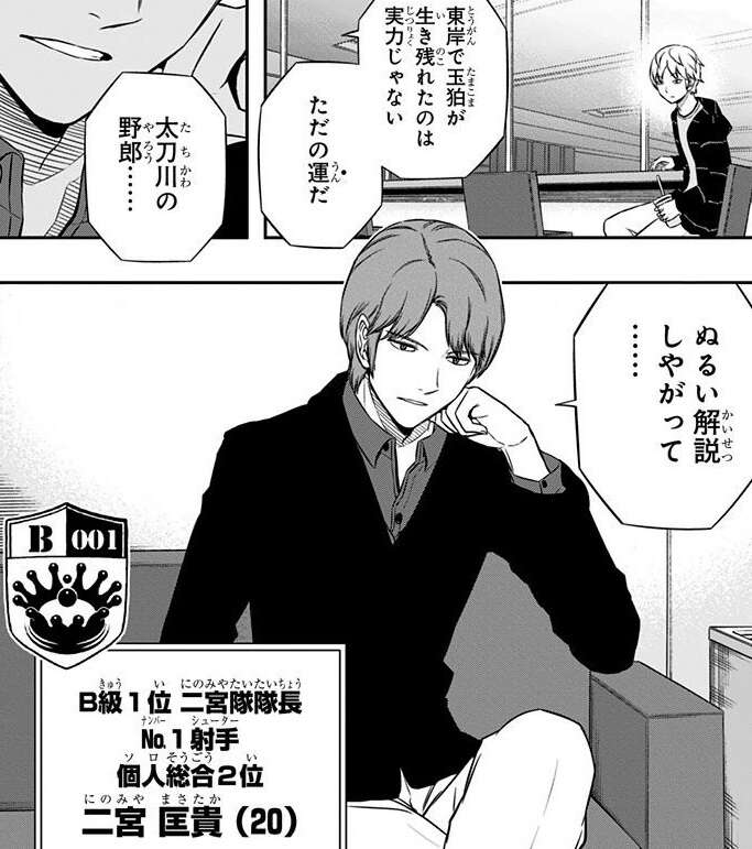 太刀川隊の出水も三雲を評価しますが、B級1位二宮隊隊長の二宮は玉狛第2のうち、空閑以外を評価せず三雲と雨取を酷評します。