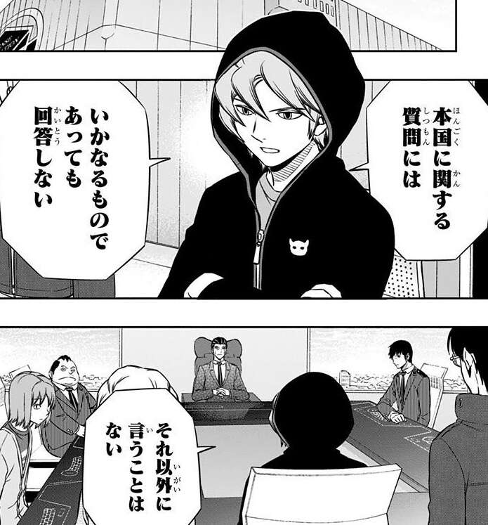 玉狛第2は見事上位グループに入り順調でしたが、ここで城戸司令が空閑の力を借りたいと空閑を本部に呼びます。気になった三雲は本部に同行しますが、そこには捕虜であり、近界民のヒュースがいます。ヒュースはアフトクラトルの情報を引き出す為本部に連行されますが、ヒュースは本国に関する質問にはいかなるものであっても回答しないと言い、険悪な雰囲気になります。