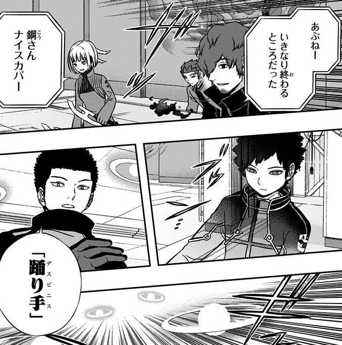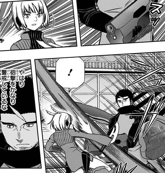 本部基地の外、三輪隊の三輪と米屋はガロプラのコスケロと戦闘状態ですが、コスケロのトリガー「黒壁(ニコキラ)」の液状のトリガー、纏わりつき取れなくなることで使用できなくする効果の前に、なかなか直接攻撃できません。しかし、「黒壁(ニコキラ)」がトリオン以外に弱いと見抜くと、トリオン以外で攻撃し建物の上に追いやります。