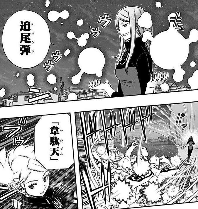 本部基地の外の戦いは、ボーダー側の連携も功をそうして有利に戦況をすすめられています。そこにトリオン兵の中に複数体動きの良いトリオン兵が現れ、ボーダーの連携が取りづらくなります。笹森、辻、木虎、黒江が動きの良いトリオン兵の対処に向かい、黒江の「韋駄天」と木虎の連携であっさりと倒します。が、トリオン兵はガロプラのヨミが操作していて、別のトリオン兵を操作する事で黒江の動きに対応してきます。