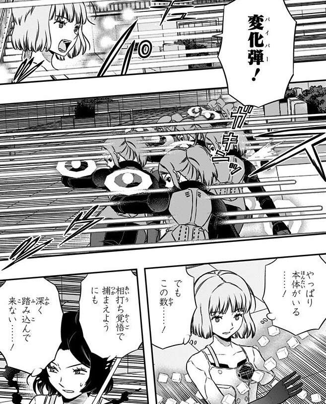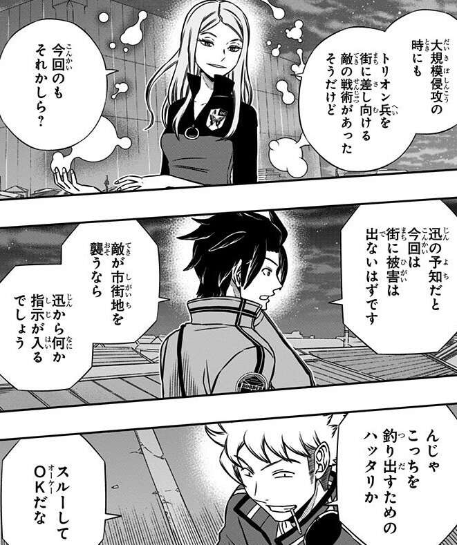 ガロプラの侵攻が本格的に始まり、本部基地の内部、外部の戦いはどちらも一進一退で決め手に欠けていましたが、外部の戦いは迅の黒トリガーと、加古隊や二宮隊の活躍でボーダー有利に戦闘が進んでいます。