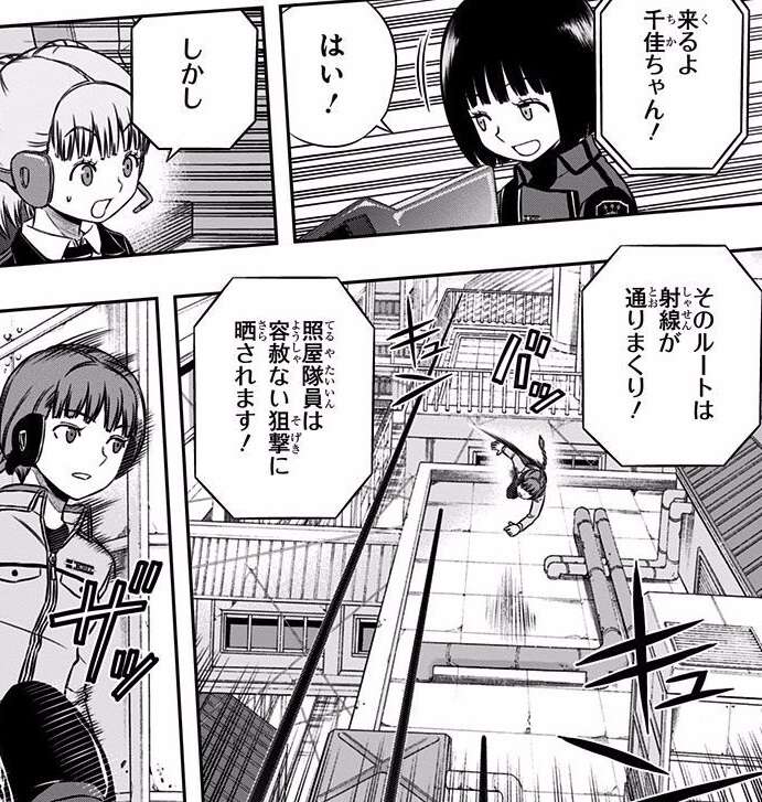 柿崎隊は遊真のワイヤー戦法に翻弄されていましたが、柿崎が隙を作る事によって千佳を狙うべく照屋が単身突っ込んでいきます。しかし、千佳の射線が通っているので照屋は思い通りに進めません。