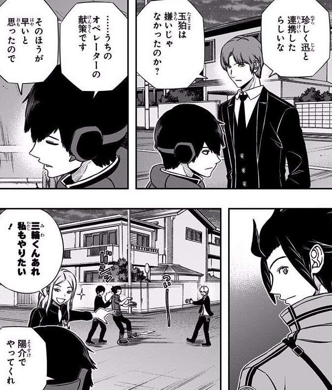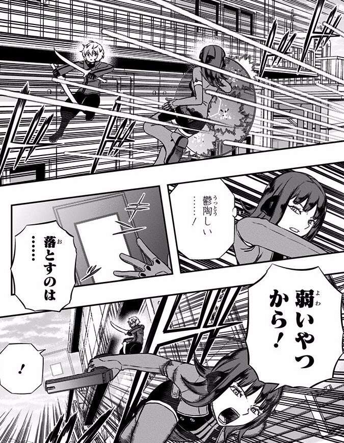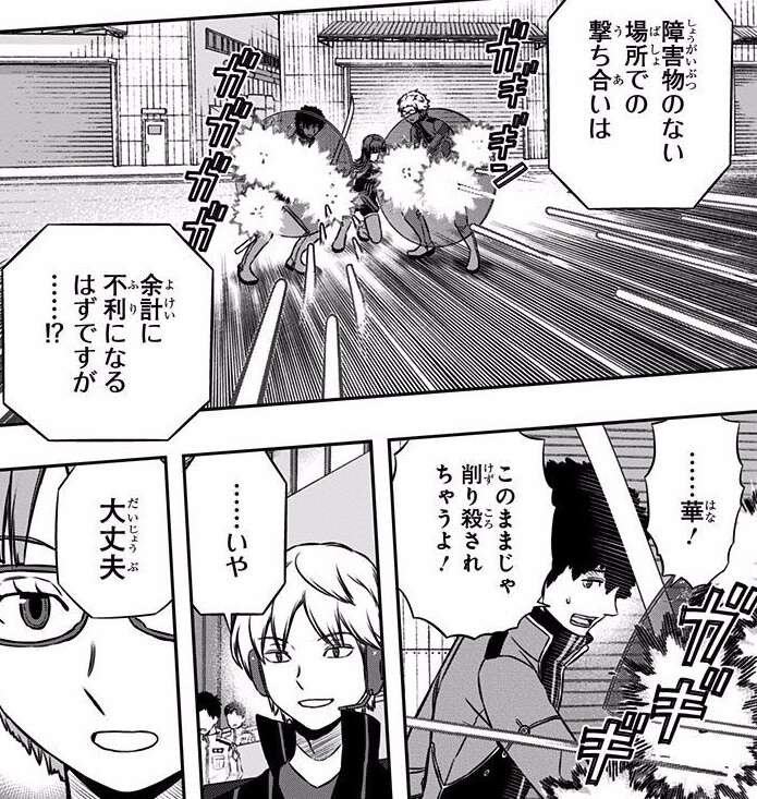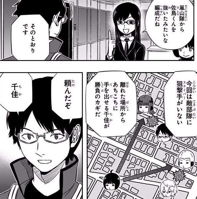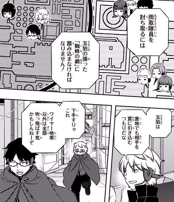 千佳の鉛弾と遊真のワイヤーを利用した攻撃に翻弄される香取隊、遊真は一気に追撃をかけますが柿崎隊が脇から手負いの香取隊を獲ろうとします。絶体絶命の香取隊ですがオペレーターの染井華の提案で場所を移動し、なんとか柿崎隊と玉狛第2を争わして玉狛第2の攻撃をかわします。