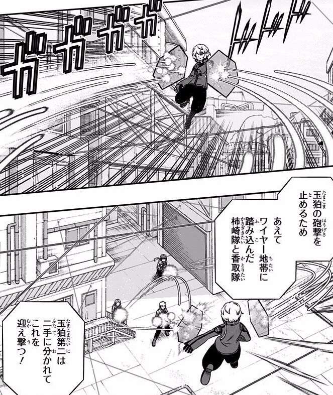香取隊と柿崎隊が玉狛第2を避けて、千佳の大砲で建物を破壊し障害物を取り除いていきます。千佳の大砲をどうにかするには、三雲の張ったワイヤー陣をどうにかしないといけませんが、ワイヤー陣内は遊真有利の為、迂闊に攻め込めません。