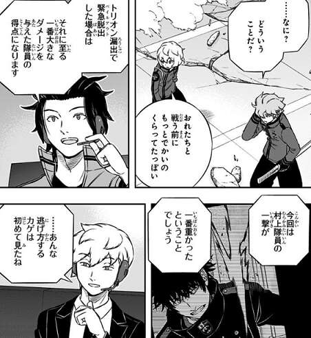 空閑とヒュースは影浦に多大なダメージを与えそのままトドメを刺そうとしますが、北添が射撃援護することによってなんとか影浦を逃がそうとします。しかし、空閑とヒュースは北添にエスクードを使って足止めしつつ、北添を緊急脱出させます。さらに影浦に対しても追撃の射撃を行い、影浦も緊急脱出させます。しかし影浦に関してはダメージを見誤ったようで、玉狛第2に得点は入りません。