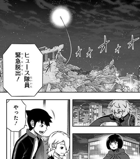 鈴鳴第一と影浦隊が倒されて、玉狛第2と東隊のみとなります。さらに玉狛第2は三雲が絵馬の狙撃でトリオン漏出が過多となっており緊急脱出してしまいます。ここで東隊はオプショントリガーのダミービーコンを起動し、攪乱を図ります。この作戦に三雲は雨取にメテオラを撃つように指示しますが、雨取のメテオラは規格外で本人も計算外でした。