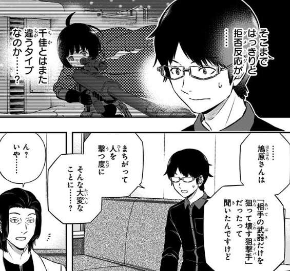ヒュースの噂に関しては、根付と東の協力もあり既に対策済みでした。三雲は対策が終わっている事に安堵していると、B級ランク戦 ROUND7で雨取がうっかり人を撃ってしまった事を東が心配してきます。東は雨取が鳩原と同様、「人を撃てない」事を気にしていて、鳩原ははっきりと拒否反応が出ていたことを東は話します。