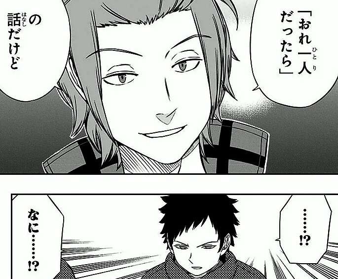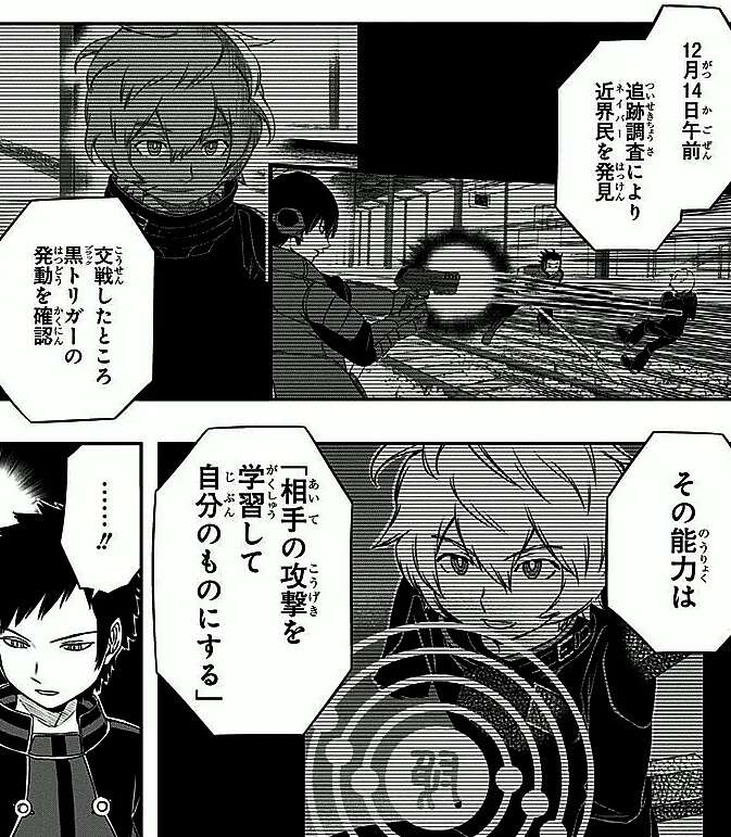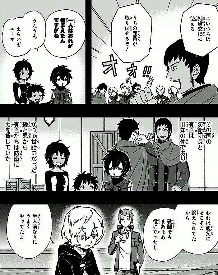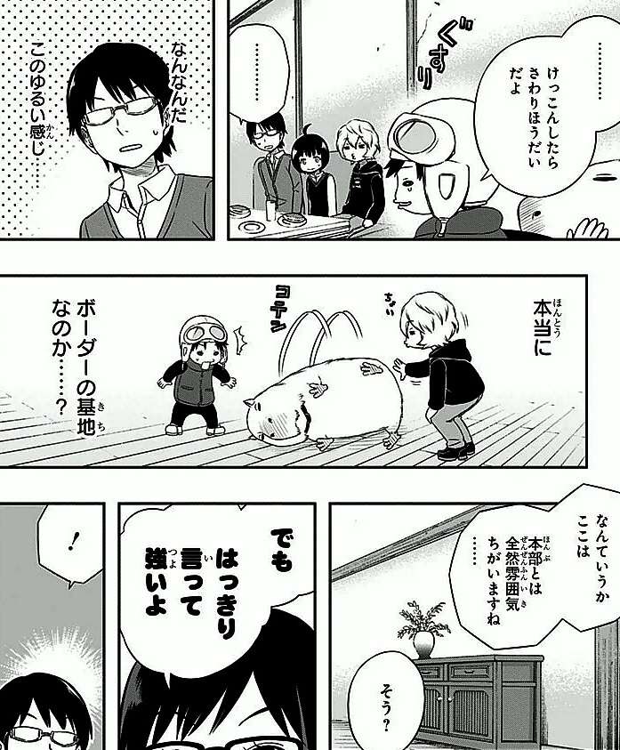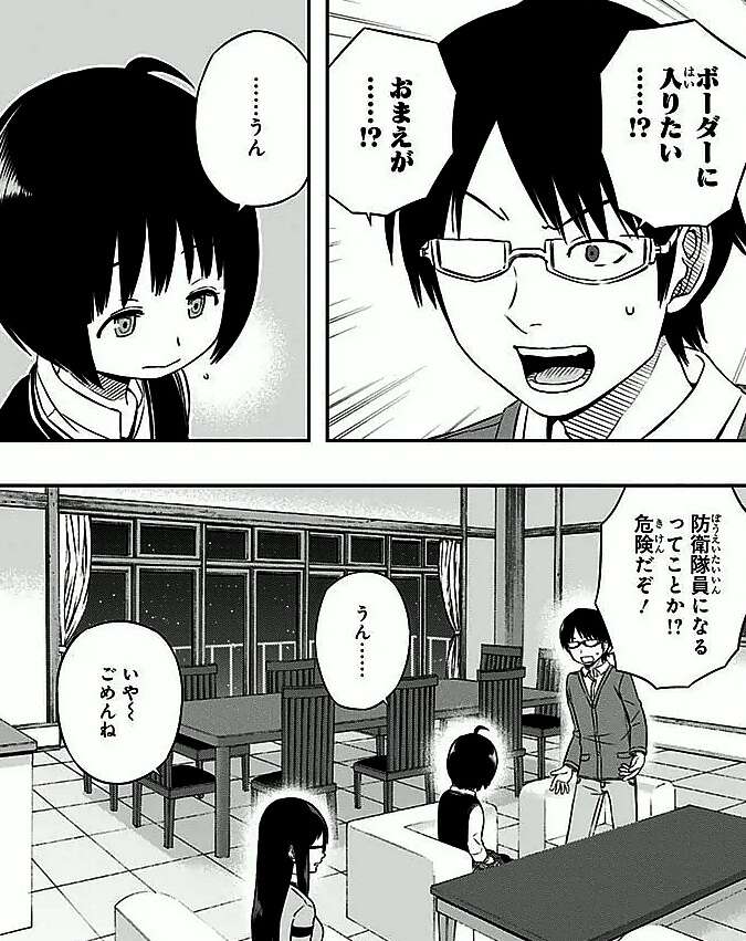 三雲は烏丸から基地の地下に訓練室があり、トリガーで空間を創って訓練室を作っている事を教えてもらいます。早速烏丸から、訓練を受ける三雲ですが三雲は弱く烏丸からあきれられます。一方、空閑は小南と戦い小南にボコボコにされます。