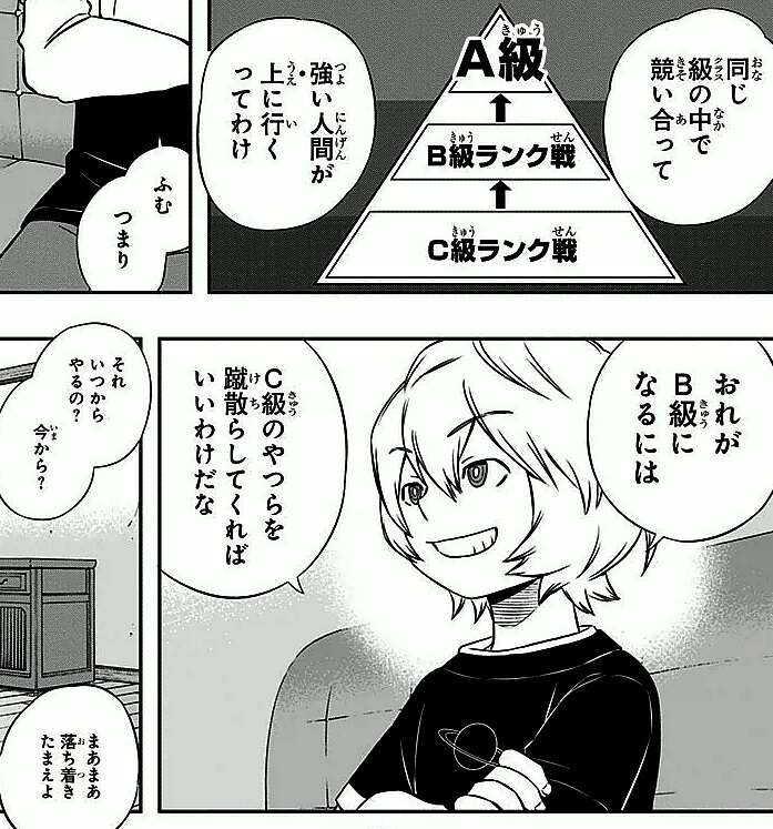 A級隊員を目指すことを目的にした三雲達ですが、玉狛支部でA級になるための説明を受けます。栞からB級まで上がるためのC級ランク戦、そしてB級以上でA級になるためのランク戦の説明を受けます。