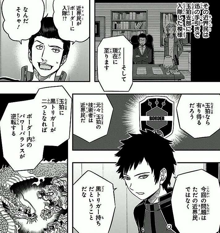 ボーダー最精鋭部隊から、未知の世界のトリガー技術を手に入れて城戸司令は満足のようです。しかし、A級の太刀川や風間に玉狛支部の黒トリガーの確保を命じ、空閑から黒トリガーを奪うように命令し、状況は混沌としてきます。