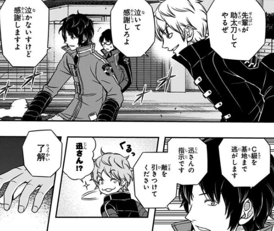 雨取達はヴィザ、ヒュースに追いつかれますが、そこに迅と空閑が加勢に来ます。空閑はヴィザを、迅はヒュースをそれぞれ食い止めて、雨取達C級隊員を基地までに逃がします。レイジの情報からヴィザ、ヒュースを連携させるのはヤバいと判断し、迅と空閑は二人を分断します。