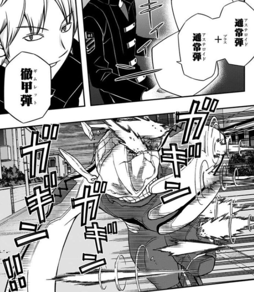 ヴィザ、ヒュースの分断に成功しますが、ヒュースと戦う迅は地下道での戦いでヒュースのトリガー「蝶の楯(ランビリス)」に苦戦します。保護色により、トリガー「蝶の楯(ランビリス)」が見えず、さらに「磁力」に「反射」の能力もありトリガー「蝶の楯(ランビリス)」に捕まってしまいます。