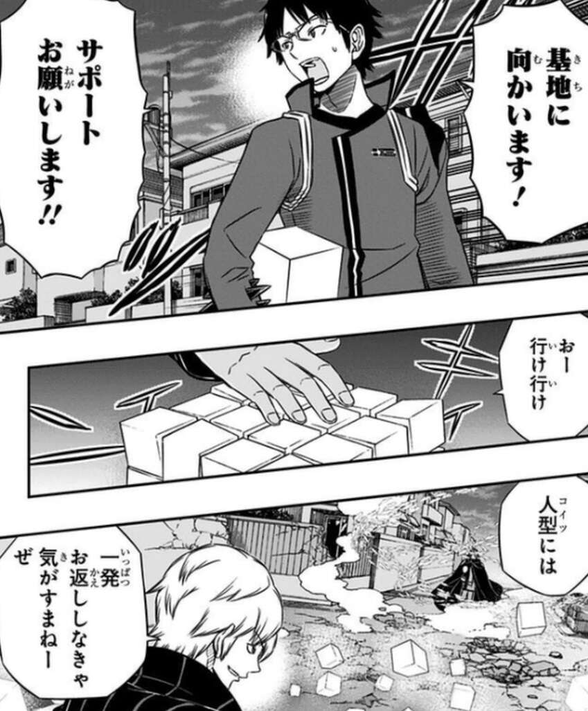 三雲はハイレインを倒そうと攻撃しますが、攻撃を防がれて逆に「卵の冠(アレクトール)」で雨取がキューブにされてしまいます。不用意に攻撃してしまった事を後悔する三雲ですが、出水はまだ基地まで行けば雨取は助かると励まし、三雲にキューブ化した雨取を連れて基地まで行くように言います。今自分がすべきことを思い出し、雨取を守りながら基地に向かいます。
